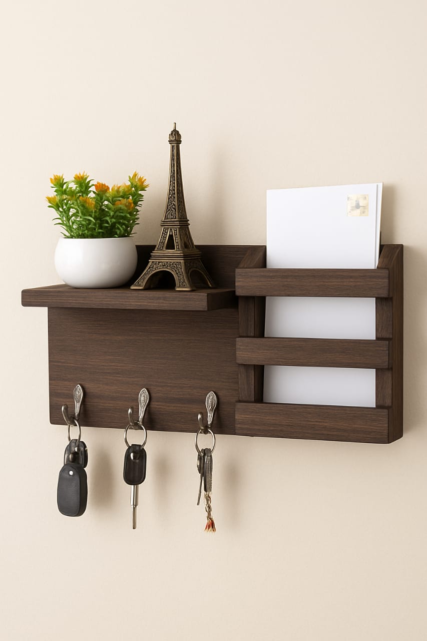 Keep your essentials within reach with the Everyday Catcher. This wall mounted organizer features three sturdy hooks for keys, a shelf for decor and a mail holder to keep your letters and notes tidy.